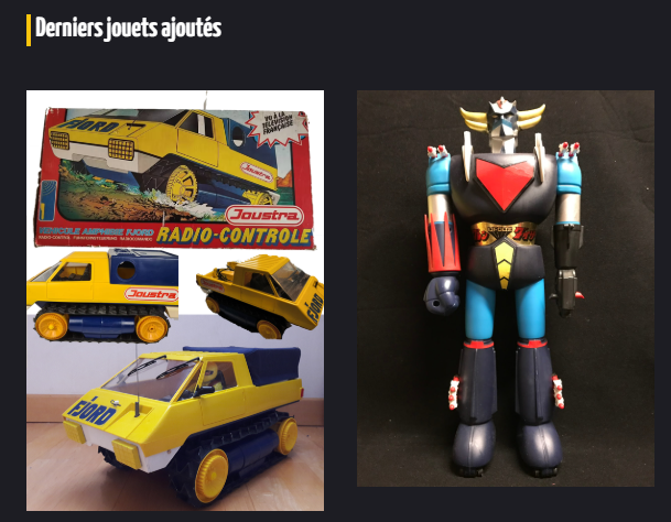 Vous y retrouverez en particulier des jouets anciens tel le Jumbo de Goldorak ou la marque Joustra et ses vehicules...